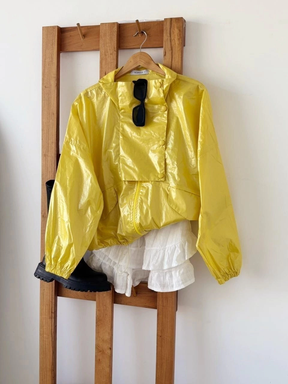 Campera paper brillante e impermeable con cierre diente de perro y solpa cubre cierre de broches, cuenta con dos bolisillos laterales y cordon regulable en la cintura.