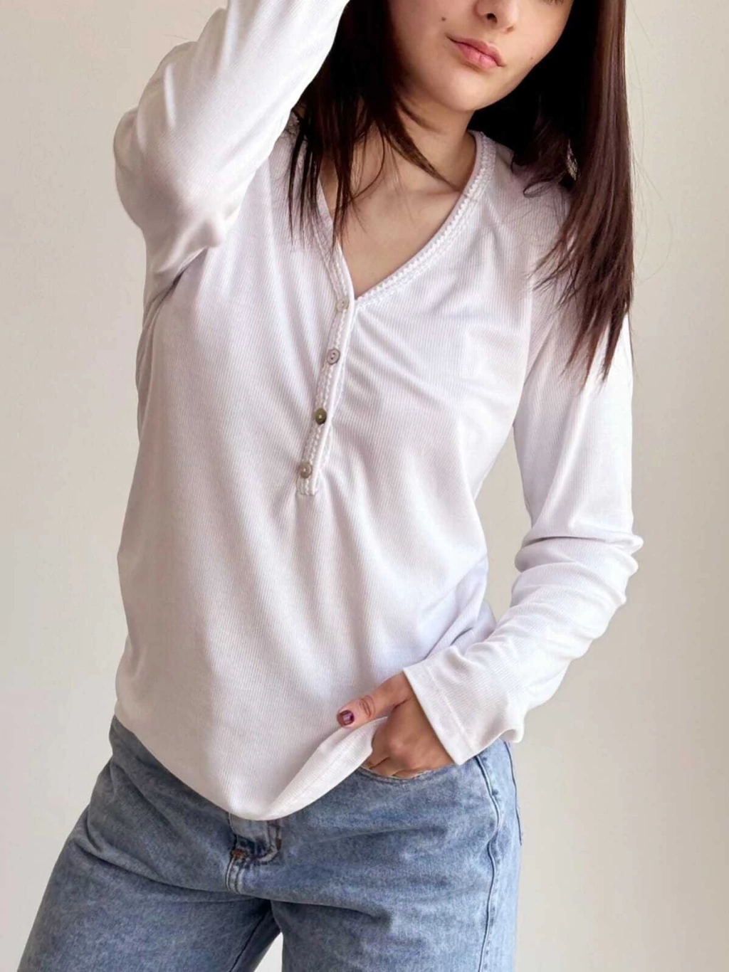 Remera de morley con carterita . Galón en todo el escote.