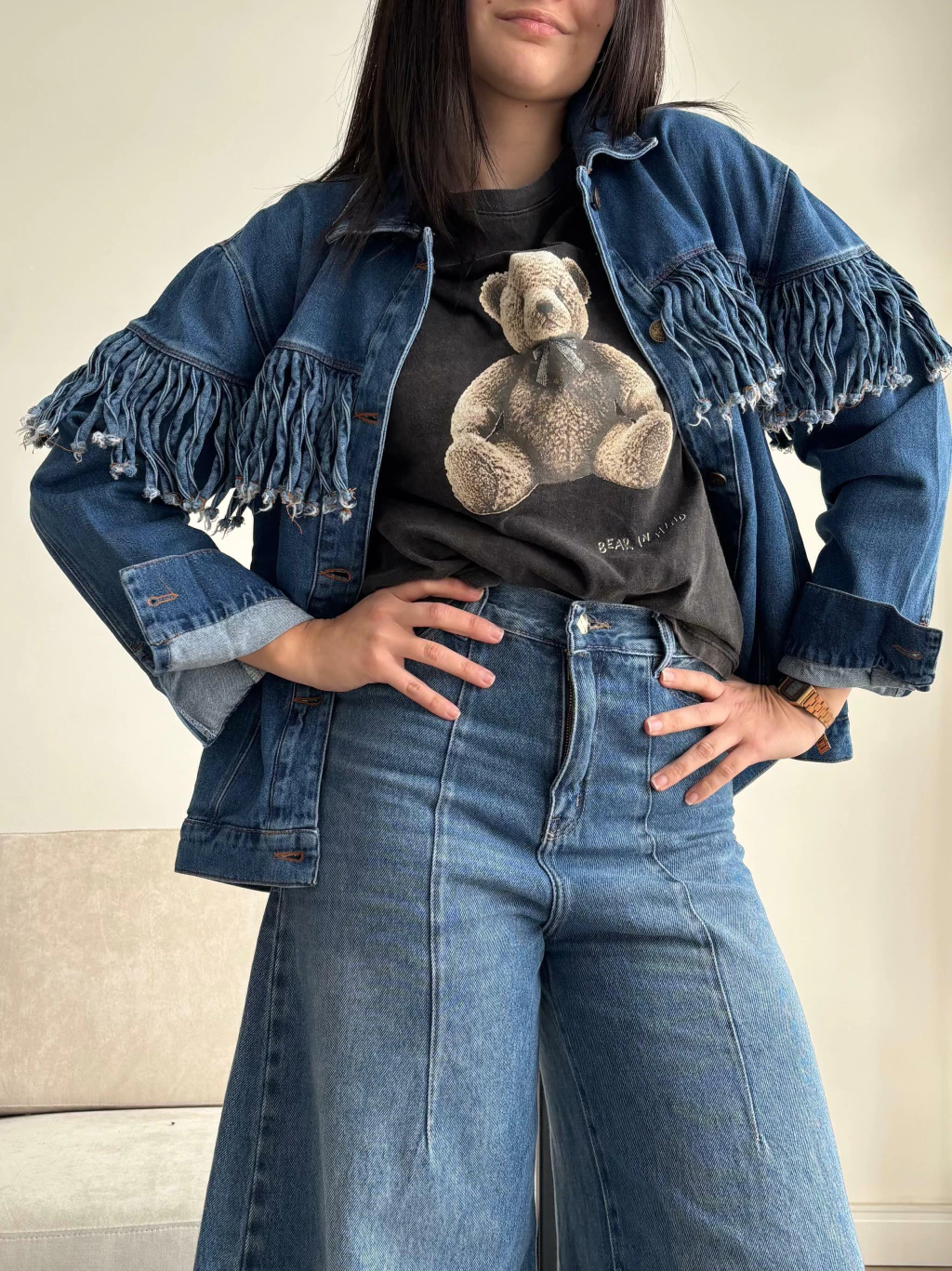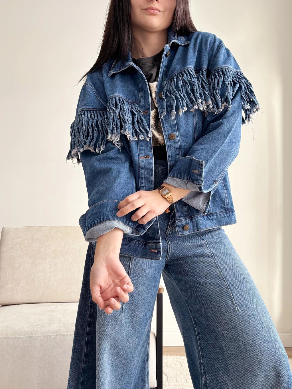 Camisaco denim , espalda con flecos.