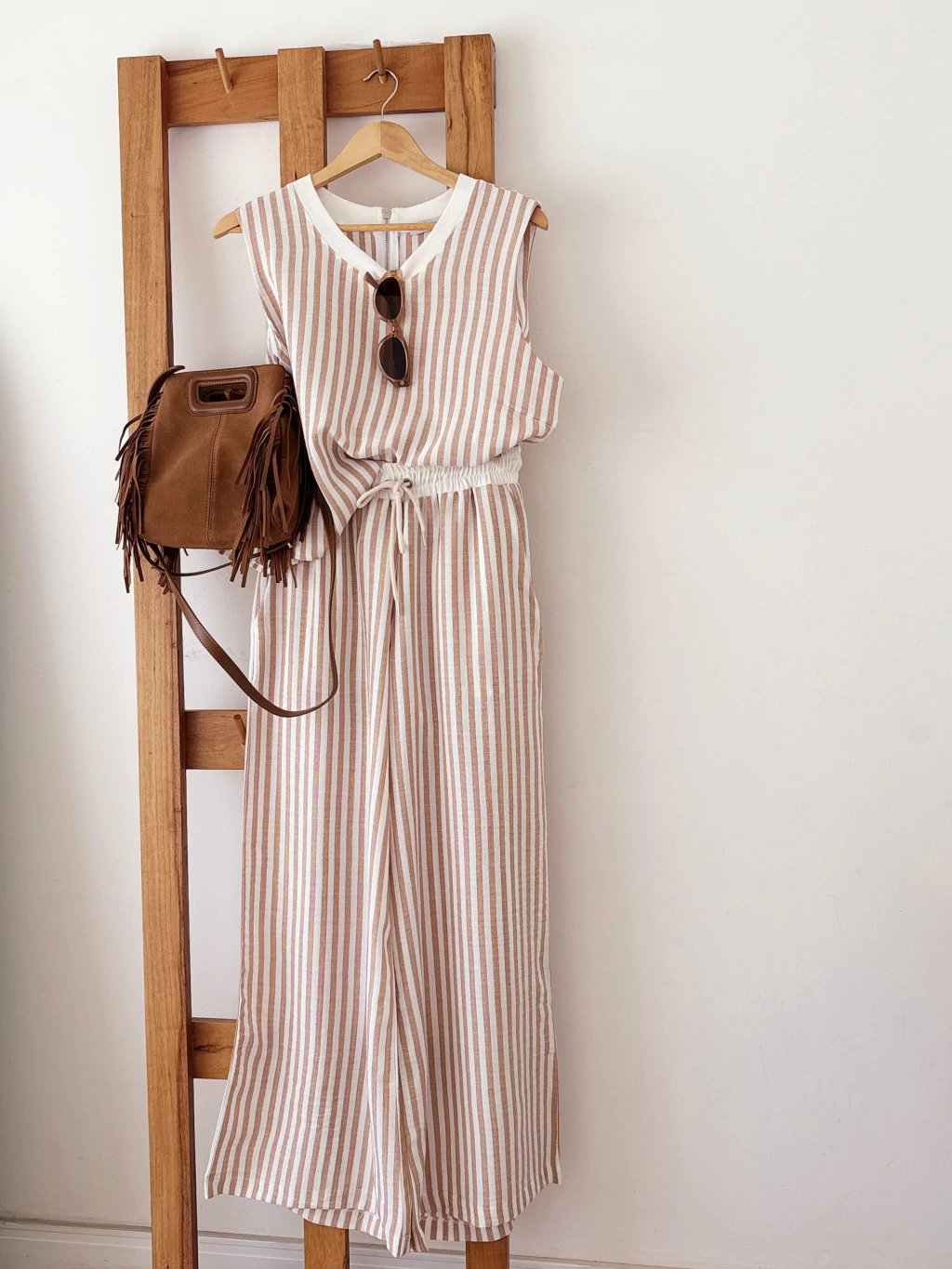 Musculosa de lino rayado , con cuello de ribb a contratono , y cierre en la espalda .